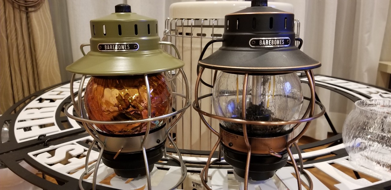 そこにベアボーンズリビングのレイルロードランタンの普通のものと色を塗り替えガラスホヤを交換したものを吊り下げました。